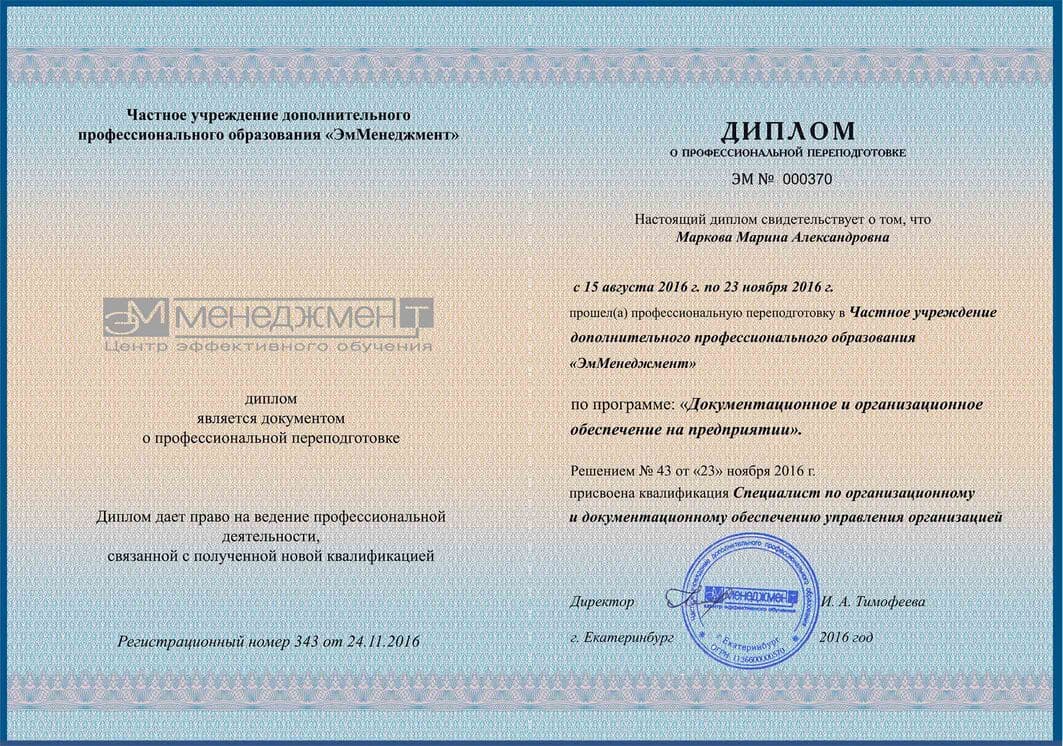 В центре ЭмМенеджмент слушателям предлагается пройти переподготовку на курсе по документационному обеспечению. По окончанию предоставляется диплом установленного образца.